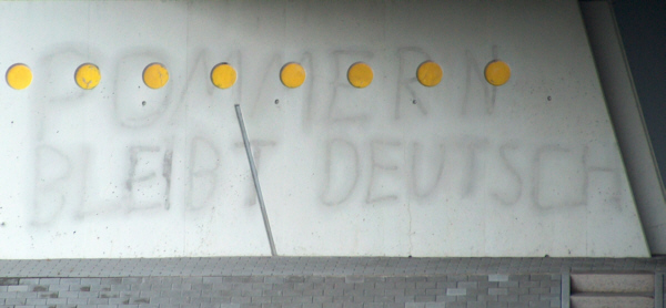 Prenzlau (ipr) „Pommern bleibt deutsch“ und „Verzicht ist verat!“ prangt matt aber in riesigen Lettern am Pfeiler der Autobahnbrücke über der Auffahrt „Prenzlau Ost“.