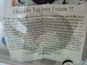 14.05.2010 Chaostag in Prenzlau verlief geordnetRund um den Tag der BefreiungPinnow (ipr) Ein Flugblatt zum 8. Mai war das einzig erkennbare Lebenszeichen, dass die rechten Kameraden in der Uckermark von sich gaben. Zwar sprach der NPD-Ortsverband Prenzlau von einer Flugblattverteilaktion im Raum Brüssow und Schwedt. Eine Bestätigung dafür ließ sich allerdings nicht finden.