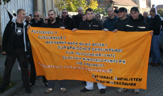 Interessanteste Erkenntnis aus der Demonstration ist die Tatsache, dass die Aktivisten der ehemaligen "Freien Nationalisten Uckermark" (FNUM) sich unter neuem Namen zusammengefunden haben. Sie gruppierten sich hinter einem orangenen Transparent "Todesstrafe für Kinderschänder", das mit "Nationale Sozialisten Barnim-Uckermark" (NS-BUM) unterschrieben war.