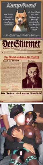 Aus der Stadtverwaltung Templin kam der Vorwurf, "gegenrede.info" hätte schlecht recherchiert. Die zu mehrjährigen Haftstrafen verurteilten rechten Schläger Matthias M. und Patrick K. seien nie Templiner Feuerwehrleute gewesen. Das ist richtig. Nur hat "gegenrede.info" das auch nie behauptet. Im Artikel "Keine Reue für 1933 bis 1945" steht lediglich, dass sie zum "nb-town" - Freundeskreis von "Matze112" gehören, der angibt aus Templin zu sein, der den Feuerwehrnotruf "112" im Profilnamen trägt und auch als Feuerwehrlobbyist bei "nb-town" auftritt. Eine gewisse Leseschwäche muss da einigen Personen attestiert werden. Das mittlerweile Templiner Pärchen "Dark_Sugar" und "firejumper91_x3" hat sich von der rechtsextremen Propaganda auf den jeweiligen Startseiten ihrer Profile getrennt. Allerdings wettert "Dark_Sugar" gegen Jappy, weil sie kurzzeitig für ihre Kinderschänder - Mord - Fantasien gesperrt worden war. Aus Angermünde meldete sich das Jappy-Profil "87strauchdieb87" zu Wort. Er beschimpfte "gegenrede.info" - Autor Peter Huth für sein "Petzen" und gab tiefere Einblicke in sein Männerbild: "du bist so was von lächerlich am besten du ziehst dir ein kleid an und stellst dich in die ecke und weinst ne runde anscheint hast du schon sehr große angst sonst würdest du nicht so ein theater machen …". Besonders erbost war Oderfrontler Herr L. - bei Jappy "Der-Doktor" - der nach wie vor antisemitische Hetze in seinem Gästebuch duldet. Erst einmal hat er richtiggestellt, dass er nicht im Oderfront - T-Shirt durch die Gegend renne. Er laufe, er habe es nicht so eilig und außerdem habe er so mehr Zeit, die Fehler des Systems zu entdecken. Außerdem beziehe sich der Satz "Aufklärung statt Hetze", der ihm als zynisch im Zusammenhang mit der Stürmer - Seite in seinem Gästebuch ausgelegt worden war, lediglich auf "sogenannte Kampfhunde" und nicht auf den "Stürmer". Herr L. hat da recht und "gegenrede.info" bittet um Entschuldigung für die nicht ganz korrekte Verknüpfung zweier Rassismen. Herr L. hatte dann kurzzeitig das "rassenwahn-Kampfhundbild" gegen das Foto eines Galgens ausgetauscht, um jetzt ganz unverfänglich ein historisches Motorrad an dieser Stelle zu präsentieren. Auch mit der Zusammenstellung der drei Bilder links, die sich zeitgleich auf seinen Profilseiten an verschiedenen Orten befanden, wird Herr L. nicht einverstanden sein. Er wird sich sicher sein, dass sein "Rassenwahn" nichts mit "Juden sind unser Unglück" und schon gar nichts mit pubertären Späßen um schwarze Gummipuppen zu tun hat.