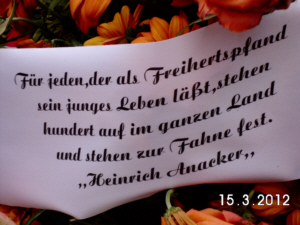 Die Schleife des einen Blumengestecks war mit einer Liedzeile des führenden NS-Dichters Heinrich Anacker beschrieben, der zahlreiche Marschlieder für die Hitlerjugend getextet hat. Von der zweiten Schleife grüßte martialisch der Jugendbund Pommern.