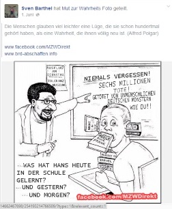 28.06.2014 Nazi Sven Barthel auf FacebookZynismus und JudenhassPinnow (ipr) Ist es Zynismus oder Unwissenheit? Der ehemalige NPD-Kreistagsabgeordnete Sven Barthel zitiert öffentlich einen von den Nazis ins Exil getriebenen Juden, um im Zusammenspiel mit einer Karikatur, den Holocaust infrage zu stellen.