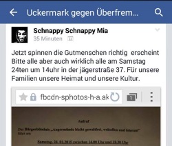 In der Facebook-Gruppe "Uckermark gegen Überfremdung und Asylmissbrauch" reagiert man unterschiedlich auf die verschiedenen Gegenaktivitäten. Da will Steven Günther aus Templin "mal sehen was von dem stinkenden Gesindel da auftreten wird". Schnappy Schnappy Mia alias Matthias Jenrich aus Angermünde hält "das pack eh wie dumm".