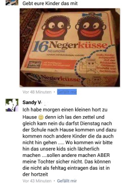 Silko S. Gibt sich konstruktiv: ich kenne da gute Lieder, die unsere Kids für das Pack singen kann." Und Rene Z. empfiehlt, den Kindern Negerküsse mitzugeben. Robbin H. fordert, dass man die Eltern, die so etwas unterstützen, gleich mit abschieben sollte.