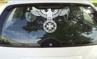 09.06.2015 Nazi-Propaganda auf der HeckscheibeUnerwartetes WiedersehenPrenzlau (ipr) Gegenrede.info erreichte ein Leserfoto auf dem die beklebte Heckscheibe eines Opels zu sehen ist: Reichsadler mit Eichenlaubkranz. Statt Hakenkreuz füllt allerdings das eiserne Kreuz den Kranz. Daneben sieht man eine Guy Fawkes- oder Anonymousmaske auf der Ablage. Recherchen von gegenrede.info ergaben, dass der Wagen auf dem AWP-Parkplatz neben dem Oberstufenzentrum Uckermark an der Brüssower Allee parkte und einen altbekannten Rechtsextremisten gehört.