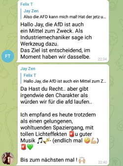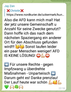 26.01.2022 Neues zur Corona-ImpffluchtAfD kapert Spaziergang-Demos in Prenzlau und SchwedtUckermark (ipr) Auch in dieser Woche sind am Montagabend wieder über tausend Menschen in vier Städten der Uckermark auf die Straße gegangen, um gegen die Corona -Maßnahmen der Bundesregierung zu demonstrieren. Die Aufmärsche verliefen größtenteils friedlich, waren aber bis auf Angermünde nicht angemeldet. In Angermünde demonstrierten etwa 85 Menschen. Die große Mehrheit hielt sich an die Abstandsregeln und Maskenpflicht. Zu Beginn gab es eine verbale Auseinandersetzung zwischen dem Demonstrationsleiter und einem Mitdemonstranten, der gegen die Maskenauflagen wetterte. Der Mann verwies auf die anderen Spaziergänge bei denen Masken keine Rolle spielten. Der Leiter stellte klar, dies sei eine angemeldete Demo. Er trage die Verantwortung und wenn er sich nicht an die Auflagen halten wolle, könne er ja gehen. Bestimmten Leuten scheint es nicht zu gefallen, dass die Demos in Angermünde überhaupt angemeldet werden. So tauchte am Montag in der Telegram-Gruppe "UM*Freie Brandenburger" folgender Post auf: "Kurze Frage in die Runde, wer kommt aus Angermünde und organisiert den (leider) angemeldeten Montagsspaziergang? Bitte melden." Demos sollen lauter werden Grundsätzlich gibt es in der Gruppe die Einschätzung, dass die Spaziergang-Demos lauter werden müssen, um ihre Forderungen an die Leute zu bringen. Allerdings waren da Parolen und Musik gemeint und nicht das Zünden von Böllern und Bengalos wie auch am Montag wieder in Schwedt. Das führt nur zu Polizeieinsätzen und Strafanzeigen. Im Gegensatz zur letzten Woche wurde die Demo diesmal nicht aufgelöst.