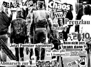 06.05.2010 Punks planen Chaostag(e) in PrenzlauGedenken anlässlich des 65. Jahrestages der BefreiungPrenzlau/Schwedt (ipr). Anlässlich des 65. Jahrestages der Befreiung vom Nationalsozialismus gibt es in der Uckermark mehrere Gedenkveranstaltungen. Sogar Prenzlaus Punks zeigen sich von ihrer spaß-politischen Seite. Am Sonnabend, dem 8. Mai, um 9.30 Uhr, wird der Bürgermeister der Stadt Prenzlau, Hendrik Sommer, am polnischen Gedenkstein auf dem Städtischen Friedhof eine Ansprache halten und ein Gesteck niederlegen. Im Anschluss daran wird im Stadtpark am sowjetischen Ehrenmal ein Kranz niedergelegt.