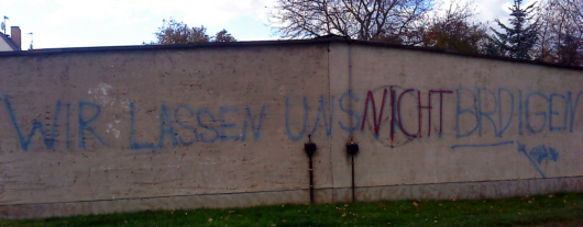 Die Nazi-Parolen der vergangenen Woche: "Gegen Krieg und Kaptal, Nie wieder Israel, Gegen Chaoten, NS Jetzt, Ruhm und Ehre, Kein Vergeben, Kein Vergessen den alliirten Kriegsverbrechen" zeichnen sich fast alle durch ein mit Schablone hergestelltes zusätzliches Signet aus, das auf eine Gruppe Nationaler Sozialisten hindeutet, die hier für die Nazi-Parolen verantwortlich zeichnen. Das Signet, dass die "Freien Nationalisten Uckermark" auf ihrem Transparent bis zu ihrer Selbstauflösung am 2. Juli 2010 vor sich hertrugen, hatte im Gegensatz zu diesem nur eine schwarze Fahne im Kreis zu bieten.