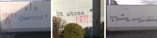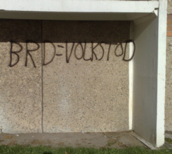 Thematisch kreisten die Nazi-Grafitti in Schwedt immer um den sogenannten „Volkstod“ für den die Bundesrepublik Deutschland verantwortlich sei. Im Oktober entdeckte die Polizei einige der rechten Kameraden in der Nähe von frisch gesprayten Parolen und leitete ein Verfahren wegen Sachbeschädigung gegen diese Personen ein. Diese Inhalte passen zur sogenannten "Oderfront". Eine Gruppe, die seit über einem Jahr in Schwedt existiert und deren Mitglieder mit entsprechenden T-Shirts zum Beispiel auf einem Dorffest in Wallmow, einer NPD-Demonstration in Anklam und am Brandenburg-Tag in Schwedt gesichtet worden waren. Auf der Rückseite der T-Shirts ist der Satz "Die Demokraten bringen uns den Volkstod" zu lesen. Innerhalb der als Kreis angeordneten Schrift sind Stadtsilhouette von Schwedt; Ortsschild und groß die Portraits des Bürgermeisters von Schwedt, Jürgen Polzehl, und des brandenburgischen Landtagsabgeordneten Mike Bischoff zu erkennen. Die beiden SPD-Politiker fühlten sich dadurch beleidigt. Es kam zur Anzeige, Anklage und zu einer Verurteilung von zwei Rechtsextremisten vor dem Amtsgericht Schwedt. ![]() Von links nach rechts am Transparent festhaltend: Die alte Garde der FNUM ist jetzt NSBUM ![]() … und Schmierereien in Angermünde. Personell gibt es enge Verbindungen zur rechten Szene in Angermünde und den dort agierenden „Nationalen Sozialisten Barnim Uckermark“. In wechselnder Zusammensetzung hat man im vergangenen Jahr gemeinsam Demonstrationen besucht. Aus den Reihen „Nationalen Sozialisten Barnim Uckermark“ soll die Stadt im Herbst 2010 im Verlauf mehrere Nächte mit rechten politischen Parolen wie "Volkstod stoppen", "NS-Jetzt" oder "Nie wieder Israel" zugesprüht worden sein. Selbst vor dem Angermünder Rathaus hatten die Rechtsextremisten nicht halt gemacht. Die gesamte Seitenfront des Gebäudes war mit einer Nazi-Parolen beschmiert worden.