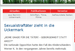 17.06.2011 Kinderschänder sind gut für die PropagandaDie NPD und das Spiel mit der AngstAltkünkendorf (ipr) Mit der irrwitzigen Behauptung, dass der Sexualstraftäter Werner K. von Joachimsthal nach Altkünkendorf in die Uckermark umgezogen sei, produzierte die NPD Barnim-Uckermark auf ihrer Website und mit einem Flugblatt eine böse Ente. Man muss das als Versuch werten, die Bevölkerung mit diesem brisanten Thema bewusst zu verunsichern.