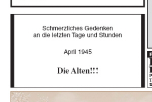 Natürlich muss man bei diesem Text spekulieren. Die bedingungslose Kapitulation der Wehrmacht fand aber erst am 7. Mai 1945 statt. Da hätte dann der Mai in die Anzeige mit einbezogen werden müssen. In den April 1945 fallen die letzten Tage im Leben von Adolf Hitler. Am 30. April beging er Selbstmord und entzog sich so der Verantwortung für seine Verbrechen. Mit dem Befehl zum Angriff auf Polen löste er am 1. September 1939 den Zweiten Weltkrieg aus. Hitler ordnet die organisierte Ermordung von Kranken in Pflege- und Heilanstalten an. Ab 1941 wurde ein Vernichtungskrieg gegen die Sowjetunion geführt. Damit begann der Holocaust, der systematische Mord an sechs Millionen europäischen Juden. Seine Politik forderte weitere Millionen von Kriegstoten und führte zur Zerstörung von weiten Teilen Europas. Bereits vor zwei Jahren gab es eine ähnliche Anzeige. Damals hieß es: "Die schweren Tage Ende April 1945 bleiben UNVERGESSEN! / Die Achtzig-Jährigen". Die schweren Tage Ende April ließen sich allerdings auch auf die fast vollständige Zerstörung der Stadt Prenzlau beziehen. siehe auch Ein Schelm, wer dabei Nazi denkt Ihre Meinung |