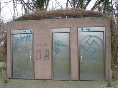 24.12.2013 Nachwuchs-Nazi-Attacke in TemplinMangel an historischer und orthografischer Kenntnis bewiesenTemplin (ipr) Die Nur-Deutschen haben in Templin mal wieder zugeschlagen – oder besser zugesprüht und an der Einfallstasse aus Lychen linkerhand kurz vor der Schleuse ein Toilettenhäuschen mit Hakenkreuzen verunstaltet.