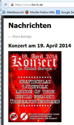 03.02.2014 Adolf Hitler zu EhrenNazi-Konzertsaison 2014 eröffnetPinnow (ipr) Seit vergangener Woche wird das erste große Nazi-Konzert für das Jahr 2014 offiziell beworben. Es soll am 19. April am Vorabend von Adolf Hitlers 125. Geburtstag irgendwo „in Mittel Europa“ stattfinden.
