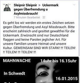 Vermutlich handelt die NPD in Abstimmung mit der gleichnamigen Facebook-Gruppe "Ucker- mark gegen ...". Deren Lautsprecher "Sleipnir Sleipnir" mobilisiert seit gestern für die von David Weide angemeldete fremdenfeindliche Mahnwache in Schwedt.