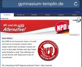 08.04.2016 Hackerangriff durch Nazis auf die Website des Templiner GymnasiumsHomepage plötzlich voller HassparolenTemplin (ipr) Am Wochenende haben vermutlich NPD-Sympathisanten die Website des dortigen Gymnasiums angegriffen. Mit Erfolg. Es wurde die Startseite ausgetauscht. Anlässlich einer vermeintlichen NPD-Sportnacht 2016 wurden Hasstiraden über den Deutschen Sportbund und über Ausländer auf der Website veröffentlicht. Wie lange die Nazi-Propagandatexte online standen, ist derzeit noch unklar.