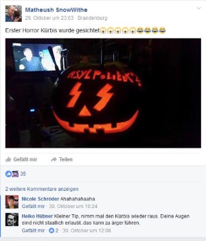 02.11.2016 Halloween und seine NazisEin Kürbis ist in der Regel ein HohlkopfSchwedt (ipr) Ein Schwedter Witzbold veröffentlicht bei "Schwedt Aktuell" das Foto eines Horror-Kürbisses. In die ausgehöhlte Frucht wurden statt der Augen zwei Siegrunen reingeschnitten. Dazu das Wort "Asylpolitik?" auf die "Stirn" geritzt.