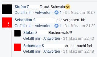 19.04.2017 Angermünder TierfreundeDem Hass freien Lauf lassenAngermünde (ipr) Ein Tierfreund aus Angermünde lässt mal wieder dem Menschenhass freien Lauf. Als Reaktion auf ein Handy-Video wird dort gefordert, Migranten zu vergasen. Es geht um das Facebook-Profil von Jan L. Das Video zeigt einen Ausschnitt aus einem Streit, der in Gewalt ausartet. Prügelnde sind wohl Migranten. Das Opfer ein Mann mit Glatze. Zwei Gramzower kommentieren: „Dreck Schwein - alle vergasen. hh – Buchenwald!!! - Arbeit macht frei“.
