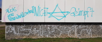 Allerdings ist dieses "Lasst euch nicht impfen" kein Nazi-Spruch. Der befindet sich 200 Meter weiter die Röpersdorfer Straße entlang direkt gegenüber der Einfahrt zur Turnhalle. "Fuck New World Order!" und "NICHT Geimpft" Zwischen die beiden Worte wurde ein Judenstern gesprüht. Es ist das gleiche Blau. Es könnten also auch der- oder dieselben Sprayer sein. In verschiedenen Verschwörungsfantasien wird die Neue Weltordnung (New World Order) als das angebliche Ziel von (Finanz)Eliten und Geheimgesellschaften bezeichnet, eine autoritäre, übernationale Weltregierung zu errichten. Beliebt sind solche Erzählungen vor allem in rechtsextremen und esoterischen Kreisen. Dass damit die Nazi-Vorstellung von der "jüdischen Weltverschwörung" am Leben erhalten wird, ohne sie konkret zu benennen, zeigt der "Judenstern" an der Hauswand.