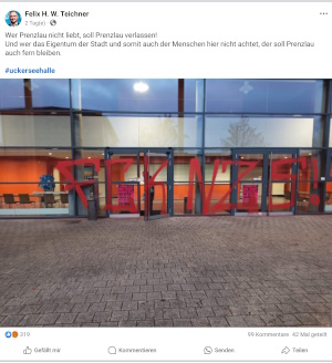 Wörtlich heißt es: "Einsatzkräfte der Polizei stellten am 23.11.2024 gegen 04:45 Uhr Schmierereien in der Paul-Gloede-Straße fest. Unbekannte schmierten einen Schriftzug auf einen verglasten Eingangsbereich. Wer dafür verantwortlich ist, klärt nun der Staatsschutz." Als die ersten Parteitagsbesucher an der Uckerseehalle erschienen, war die Sprüherei wieder entfernt. Es ist dem AfD-Landtagsabgeordneten Felix Teichner zu verdanken, dass die Anti-AfD-Aktion überhaupt öffentlich sichtbar wird. Auf seinem Facebook-Profil postet er ein Foto der Eingangshalle und formuliert dazu seine lokale "Rausschmiss-Fantasien": "Wer Prenzlau nicht liebt, soll Prenzlau verlassen! Und wer das Eigentum der Stadt und somit auch der Menschen hier nicht achtet, der soll Prenzlau auch fern bleiben." Er dementiert allerdings die Aufforderung des gesprühten Textes nicht: "FCK NZS!". Im Gegenteil, er sorgt sogar für die Verbreitung. über vierzigmal wurde das Foto schon geteilt. Ihre Meinung |