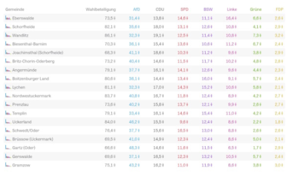 24.02.2025 Bundestagswahl 2025Uckermark ist NazilandPrenzlau (ipr) Der vom Militärischen Abschirmdienst als Extremist eingestufte AfDler Hannes Gnauck gewinnt überlegen das Direktmandat im Wahlkreis Uckermark – Barnim I mit 38,41 % der Wähler:innenstimmen. Stefan Zierke (SPD) und Michael Kellner (Die Grünen) schaffen den Wiedereingliederung ins Parlament über die jeweilige Landesliste. Der Wahlkreis geht mit 36,0 Prozent der Zweitstimmen an die AfD. Dahinter folgen mit deutlichem Abstand die CDU (16,1 Prozent) und die SPD (13,8 Prozent). Die Wahlbeteiligung liegt bei 78,9 Prozent (+7,3 Prozentpunkte im Vergleich zur vergangenen Bundestagswahl). Verglichen mit der Bundestagswahl 2021 gewinnt die AfD 16,1 Prozent. Sowohl die Linke (+2 %) als auch die CDU (+0,8%) gewinnen hinzu. Dagegen verlieren die SPD (-17,5 %) , die FDP (-5,4 %) und die Grünen (-2,2 %). Das BSW erreicht einen Stimmanteil von 12,4 %.